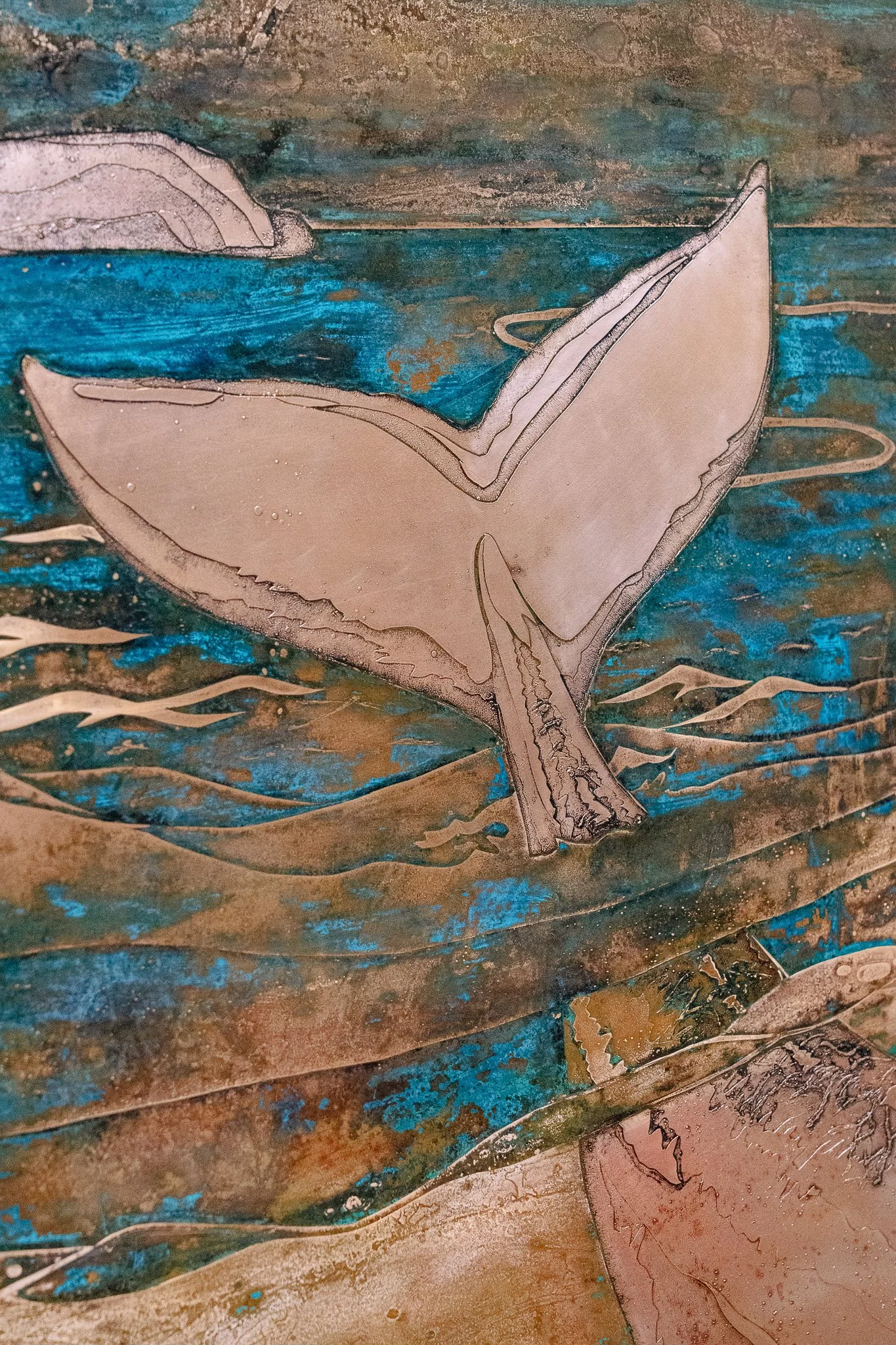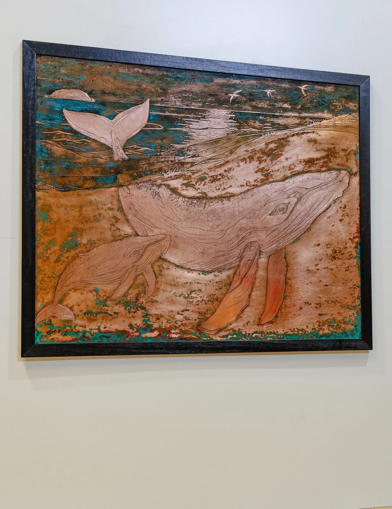 This beautiful etched copper wall art was created for a local client, representing our beautiful stretch of ocean along the Mid North Coast of NSW, renowned for its whale watching and seasonal humpback migration. The 1200mm x 1500mm sized artwork is framed in a custom made “Sugi Ban” charred hardwood frame.